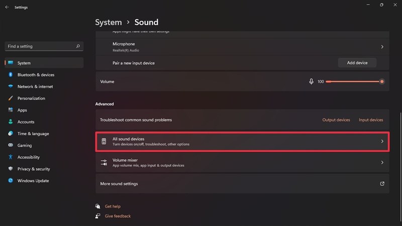 Bước 3: Sau khi đã chọn Sound, bạn hãy tìm đến phần Advanced và chọn vào All sound devices.