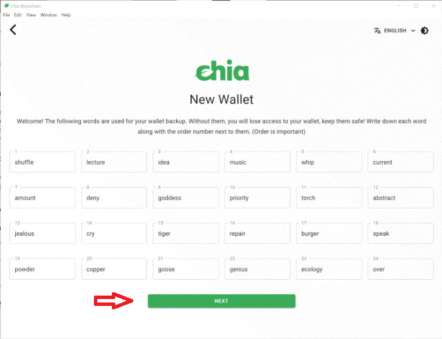 Bước 3 : Ở bước này, phần mềm Chia sẽ cho phép bạn tạo một ví Chia mới với một loạt từ mà bạn phải ghi nhớ. Để an toàn hơn, bạn có thể dùng điện thoại để chụp sao chép và lưu giữ các từ khóa này lại.