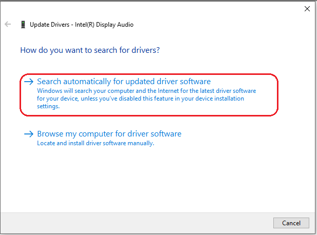 Bước 3: Lúc này, Window sẽ bước vào quá trình cập nhật Driver âm thanh. Ở đây sẽ có 2 lựa chọn, bạn chọn dòng đầu tiên Search automatically for updated driver software để tự động tải về driver từ trên mạng Internet.