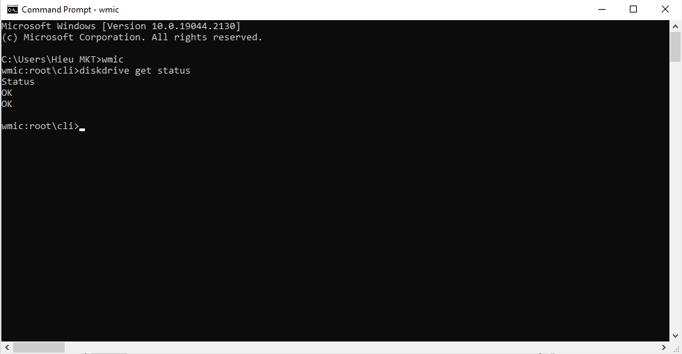 Bước 2: Vào cửa sổ Command Prompt gõ lệnh wmic => Bấm Enter. Sau đó gõ tiếp lệnh diskdrive get status => bấm Enter. Nếu ổ cứng bạn hoạt động tốt thì có dòng OK xuất hiện, còn nếu không có dòng này bạn nên đi sửa chữa lại ổ cứng của mình để dữ liệu luôn được an toàn.