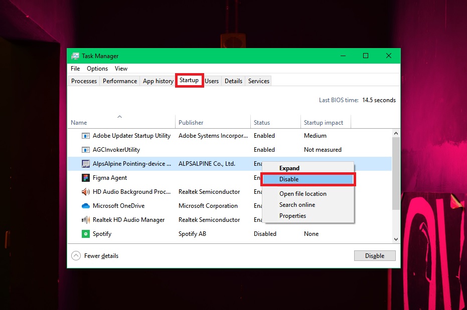 Bước 2: Nhấn vào tab Startup, nhấn chuột phải vào ứng dụng bạn muốn ngừng khởi động cùng máy tính > Chọn Disable.