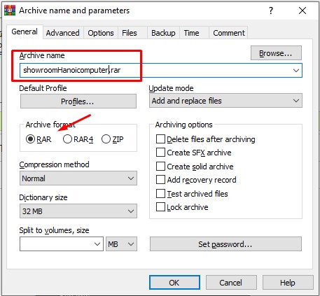 Bước 2: Ở tab General, ngay mục Archive format, bạn có thể chọn nén thành file đuôi Rar hoặc Zip. Đặt tên file nén trong ô Archive name.