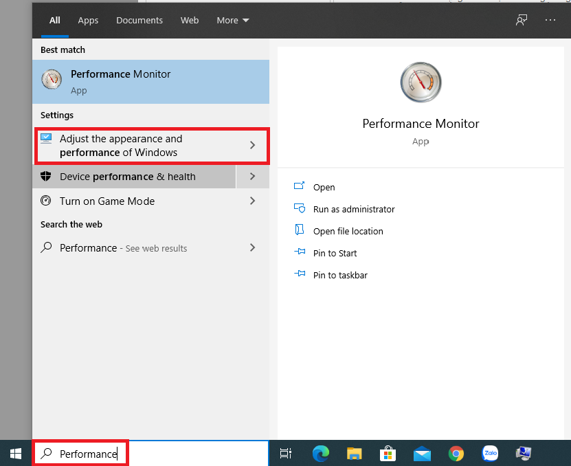Bước 1: Tại ô tìm kiếm của Window, các bạn gõ Performance sau đó chọn Adjust the appearance and performance of windows