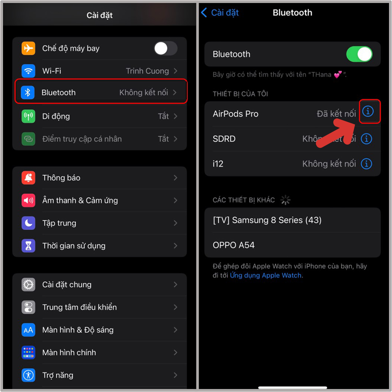 Bước 1: Truy cập vào Cài đặt ở iPhone > Nhấn chọn Bluetooth > Click chữ i bên cạnh tai nghe AirPods Pro.