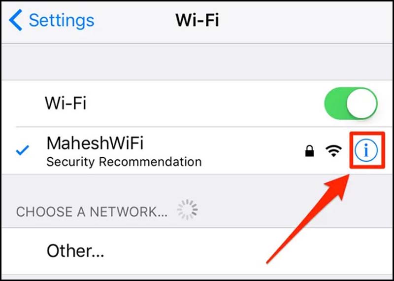 Bước 1: Bạn truy cập vào phần Cài đặt > Chọn Wi-Fi > nhấn vào biểu tượng chữ i như hình.
