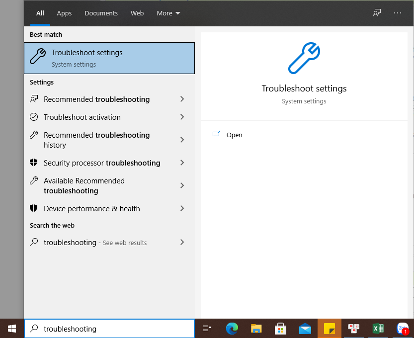 Bấm Start hoặc phím Window, nhập vào ô tìm kiếm troubleshooting và ấn Enter.