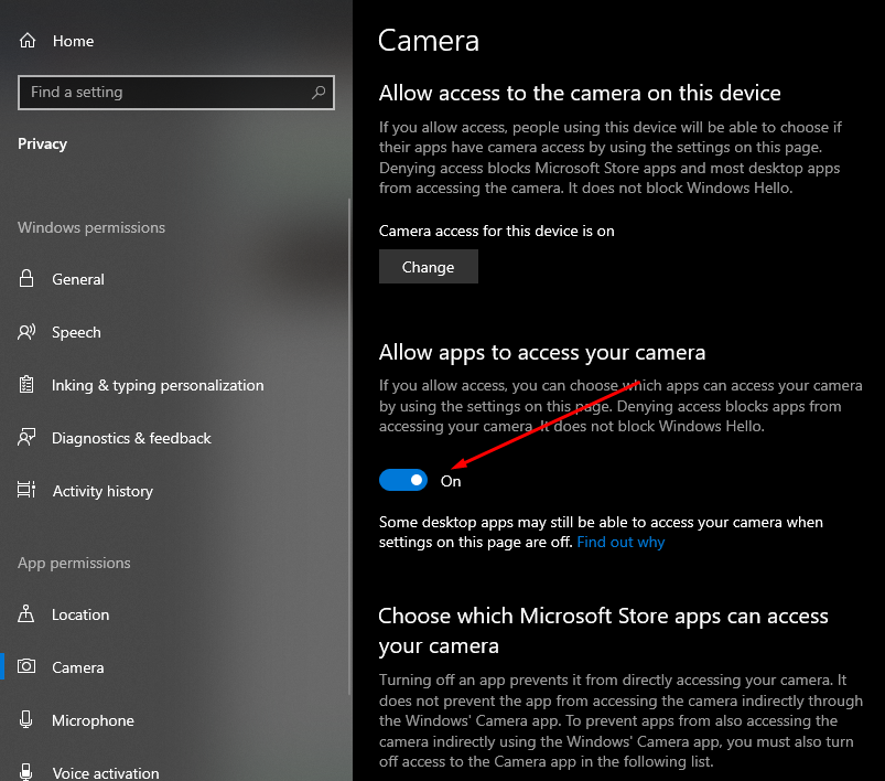 Chọn mục Camera > Trong dòng Allow app to access your camera chuyển sang chế độ On.