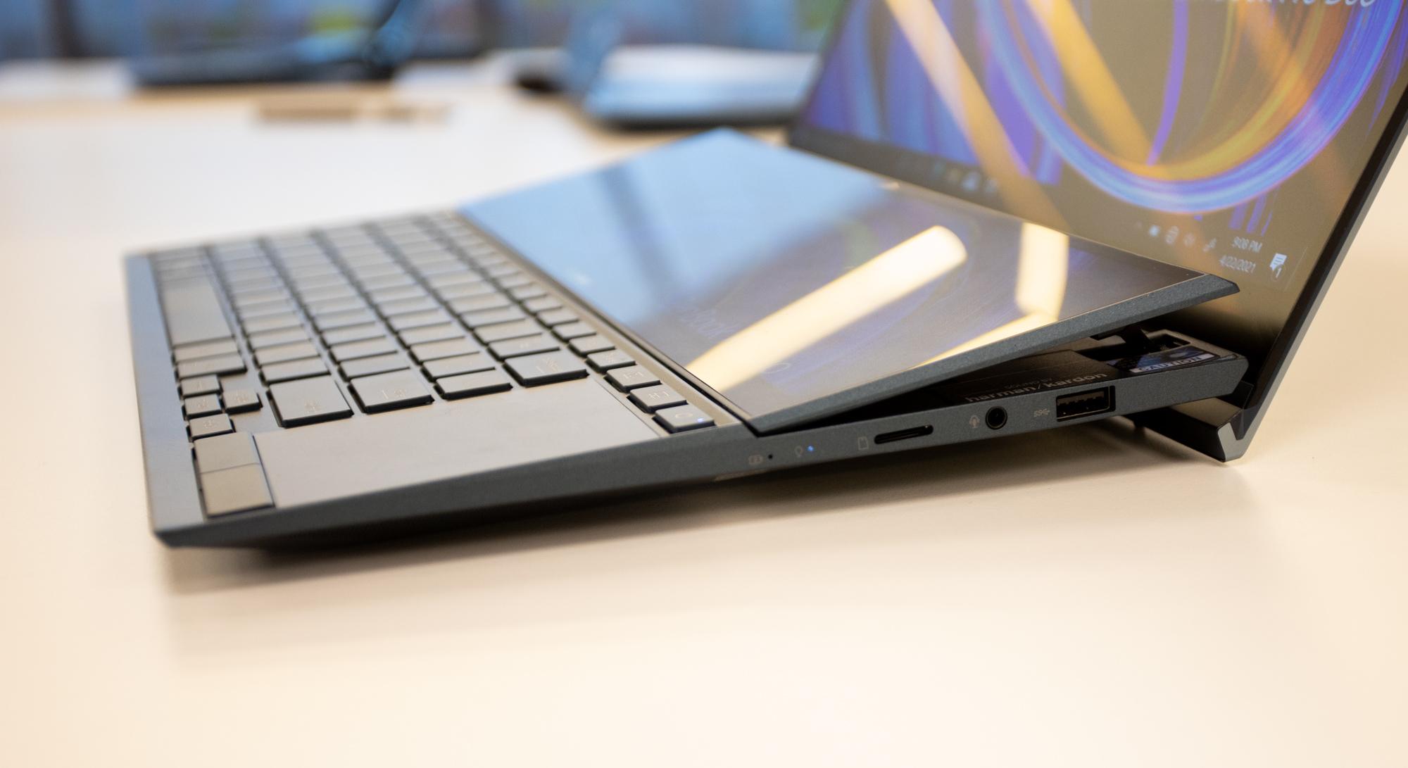 Chiếc máy hỗ trợ các cổng kết nối thời thượng hiện tại bao gồm USB type C, type A, HDMI và đầu đọc thẻ micro SD. Chúng được bố trí rất hợp lý ở 2 cạnh trên máy. Tuy nhiên, ZenBook Duo 14 2021 vẫn dùng cổng sạc tròn nhỏ chứ không tích hợp luôn vào cổng USB type C, điều này hơi bất tiện một chút nhưng cũng không phải là điểm trừ lớn.