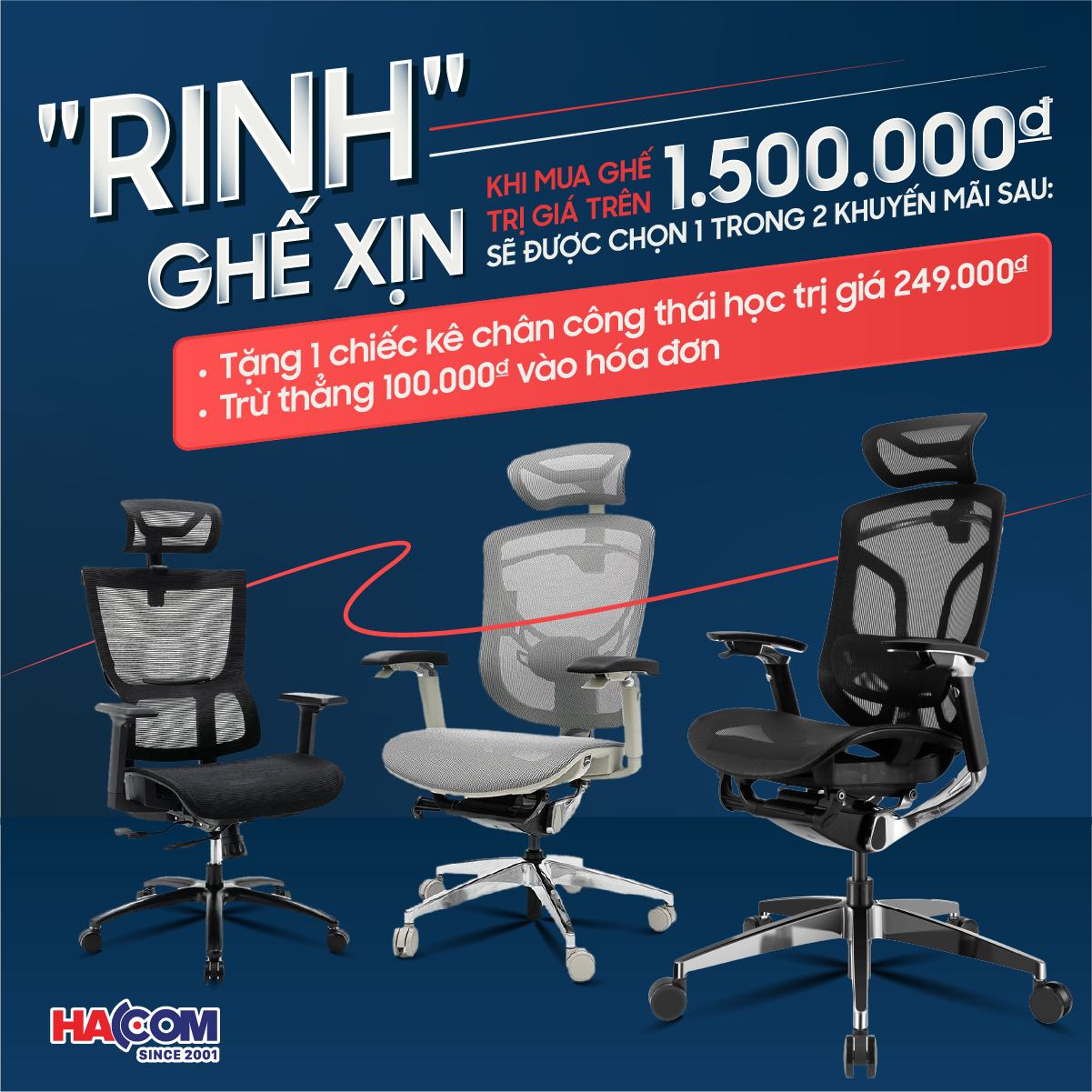 - Tặng kèm kê chân công thái học trị giá 249.000đ, hoặc trừ 100.000đ cho các sản phẩm ghế trị giá trên 1.500.000 triệu.