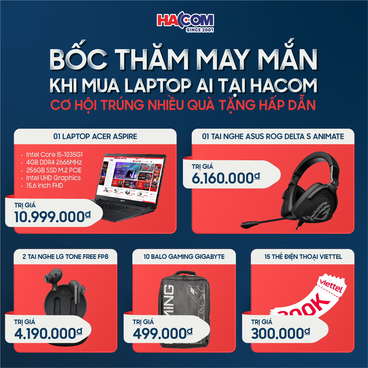 Khi mua Laptop AI bất kỳ tại HACOM, bạn sẽ được tham gia bốc thăm trúng thưởng những phần quà sau:
