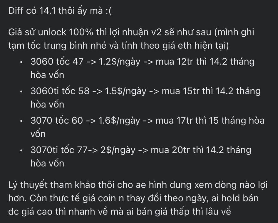 Còn mẫu card mới nhất của Nvidia, RTX 3090 Ti thì đạt tốc độ khoảng 125 đến 130 MH/s. Điều này đồng nghĩa với việc bên nước ngoài, mua card giá gốc thì cũng phải mất hơn 1 năm, cụ thể là 400 ngày mới hoàn vốn, chưa tính tiền điện. Nhưng RTX 3080 thì kinh tế hơn, chỉ mất từ 250 đến 280 ngày mà thôi. Thậm chí trên các group trâu cày, những “nông dân” đã tính nhanh được luôn khả năng hoàn vốn của những chiếc card Nvidia với mức giá của cả những phần cứng PC lẫn giá ETH hiện tại: