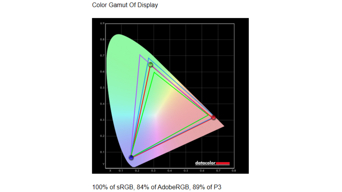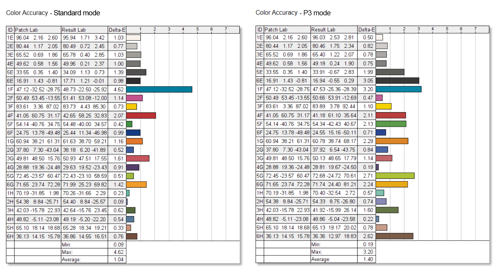 Cuối cùng, khi thử ở chế độ sRGB, Delta-E trung bình đã đạt ở mức 1.2. Cùng với đó, độ phủ màu sRGB xuống còn 91% một cách kỳ lạ. Đồng thời độ tương phản xuống còn 1050:1. Độ sáng đạt đỉnh ở mức 465 cd/m2, xét cho cùng thì kết quả này vẫn ở mức tốt. Điều này đồng nghĩa là người dùng sẽ phải lựa chọn giữa độ phủ màu rộng hay ưu tiên sự sai lệch về màu thấp. Tất nhiên, đó chỉ là chế độ được cài đặt sẵn trong màn hình. Để tối ưu lại hiệu suất, người dùng buộc phải sử dụng thiết bị cân màu chuyên dụng. Bằng chứng là sau khi tinh chỉnh, độ phủ màu đã đạt ở mức 97% và Delta-E chỉ ở mức 0.5.