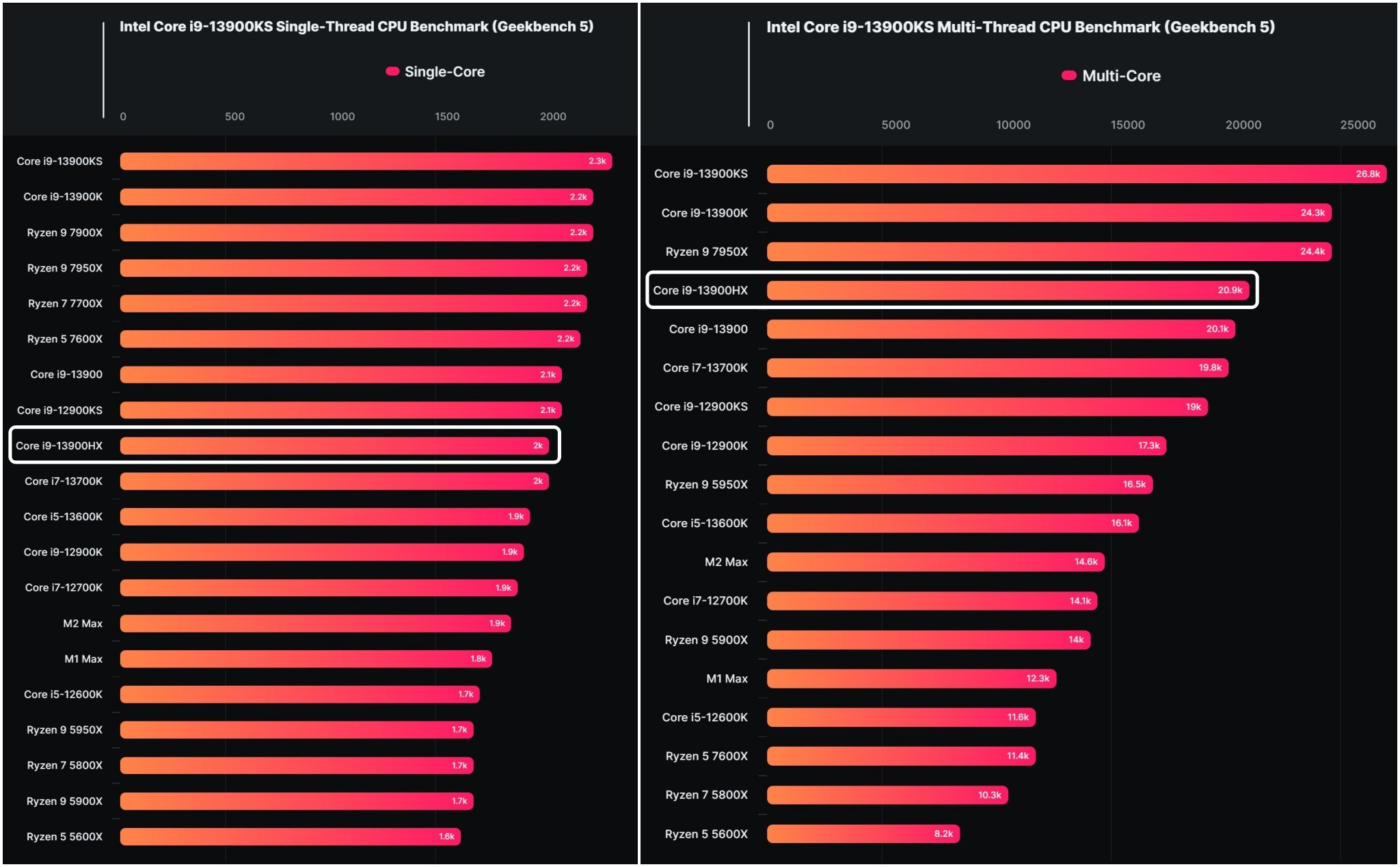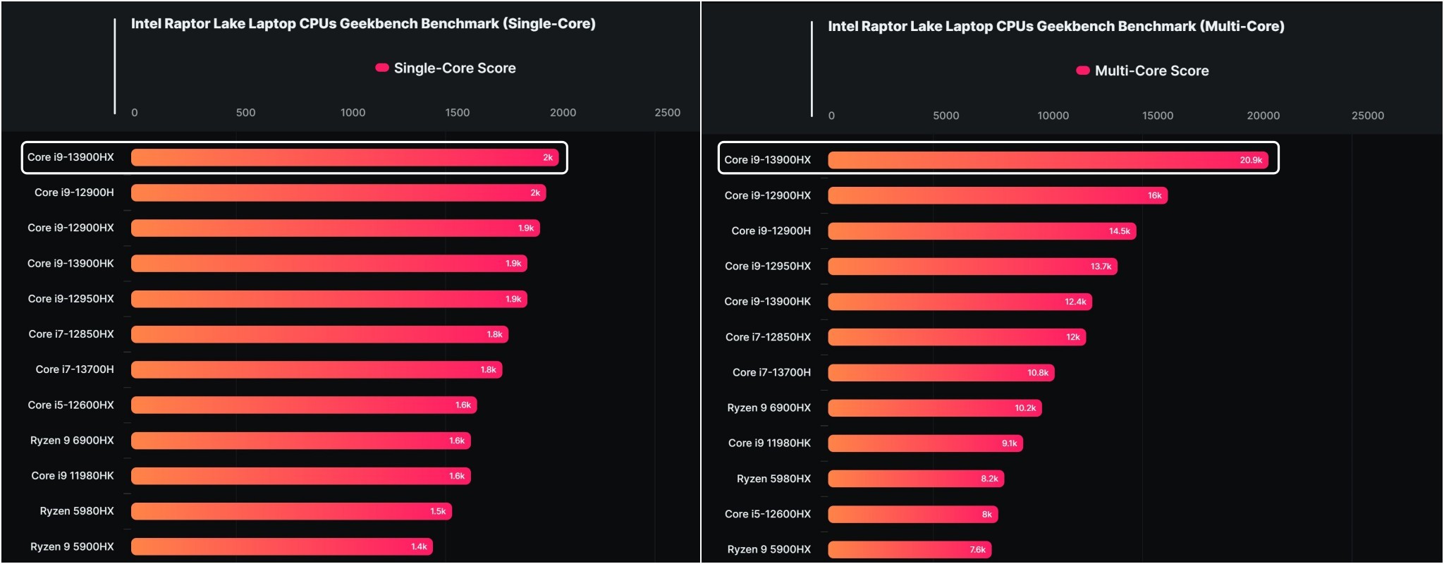 Với hơn 2000 điểm đơn nhân và hơn 20 ngàn điểm đa nhân thì Core i9-13900HX hiện đang là vi xử lý mạnh nhất cho laptop. Wccftech đã làm 2 bảng so sánh điểm Geekbench giữa các vi xử lý hiệu năng cao cho laptop và có thể thấy mức điểm đa nhân trên 20 ngàn điểm lần đầu tiên đạt được với một vi xử lý laptop. Trong khi đó mức điểm đơn nhân trên 2000 điểm cũng đã vượt Core i9-12900H hay HX.