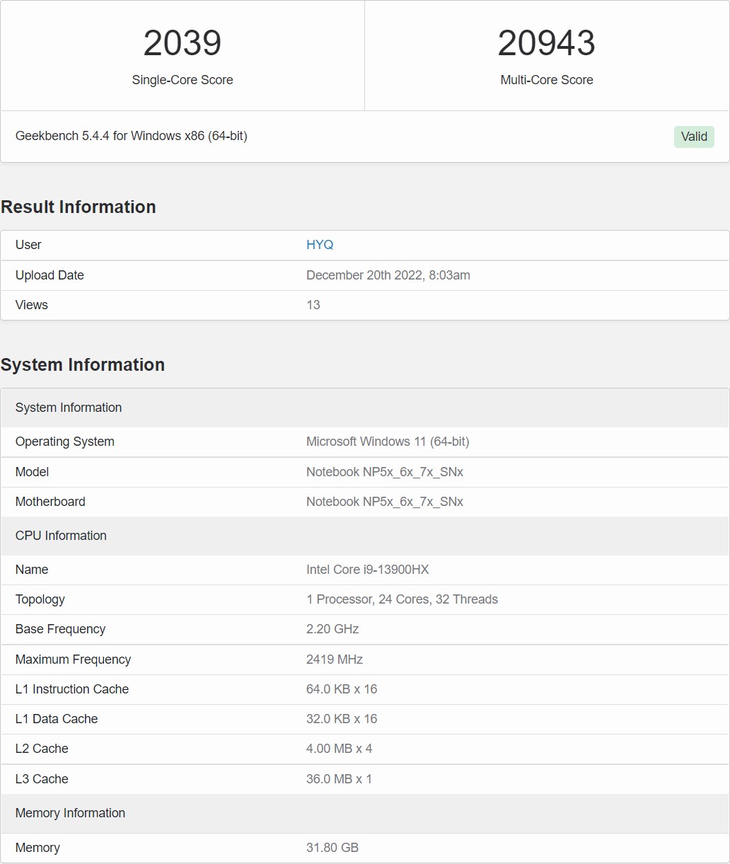 Hiệu năng của Core i9-13900HX lộ trên Geekbench với điểm đơn nhân đạt 2039 điểm và 20943 đa nhân. Chưa rõ vi xử lý này được test trên chiếc máy nào nhưng dựa vào tên mã bắt đầu bằng tiền tố NP thì rất có thể đây là một chiếc máy của Samsung, có thể là một chiếc Odyssey Gaming. Trước đó Core i9-13900HX cũng đã xuất hiện trên chiếc Razer Blade 18.