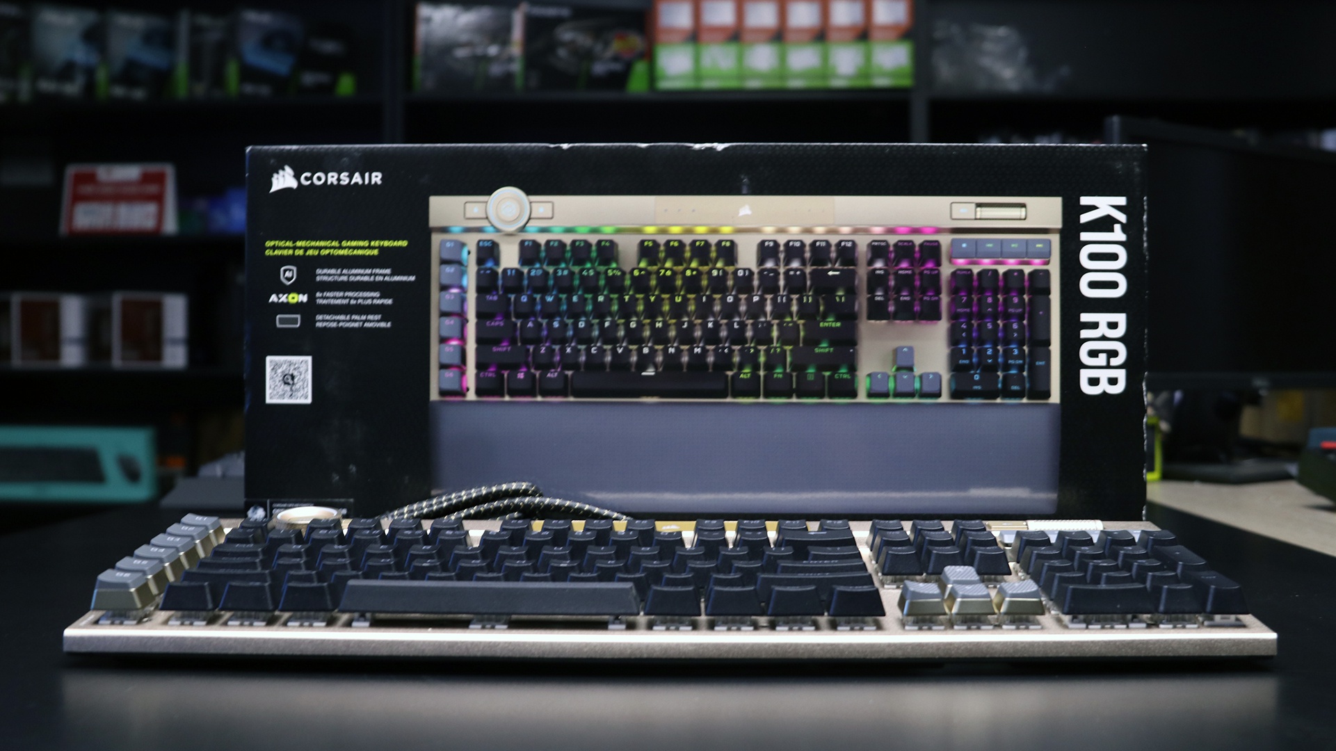 Đèn LED trên mỗi nút bấm đều có thể được cài đặt riêng biệt, và nhìn chung là rất sáng và rõ. Bề mặt của Corsair K100 được phủ một lớp hợp kim nhôm xước và các nút bấm được thiết kế để ánh sáng lọt qua một cách tinh tế.