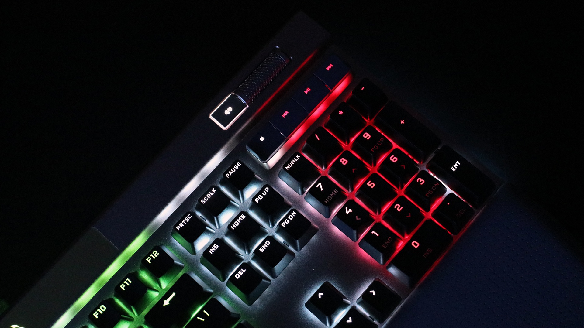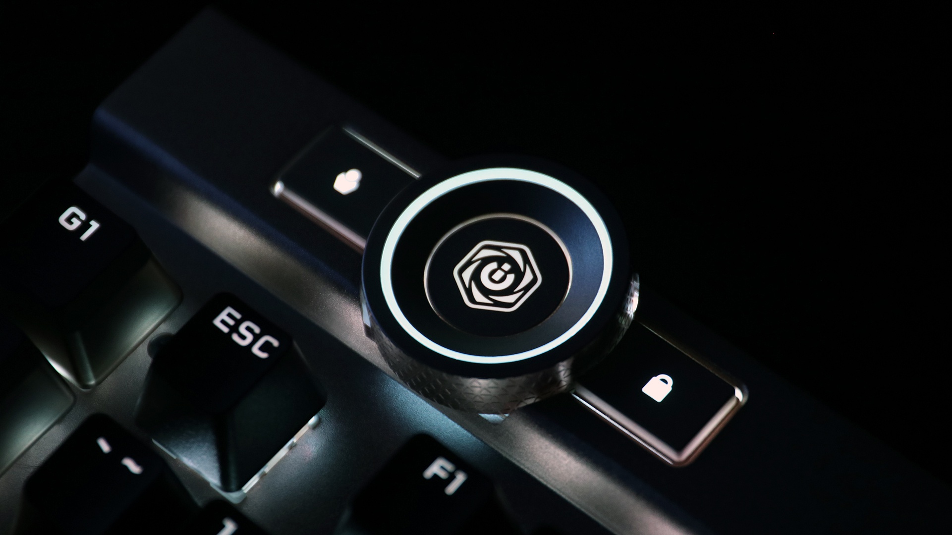 Trên cùng bên trái của Corsair K100 là một núm xoay có thể được sử dụng cho 8 tính năng khác nhau, từ qua bài và thay đổi ứng dụng cho đến trượt trang web và thay đổi độ sáng đèn LED RGB. Chính giữa của núm xoay là một nút bấm thông thường, và các nút bấm ở 2 bên cho phép game thủ thay đổi giữa các bộ thiết lập khác nhau cũng như kích hoạt chế độ Game.