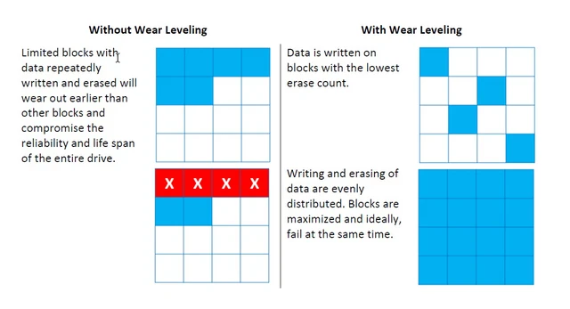 Tính năng này cho phép bộ điều khiển SSD phân chia việc đọc/ghi dữ liệu đồng đều cho tất cả "cell" trong chip nhớ SSD, thay vì chỉ tập trung đọc/ghi vào một số "cell" nhất định từ năm này qua tháng nọ và khiến chúng mau hư hơn những "cell" còn lại. Khả năng cao là bạn sẽ ráp một bộ PC mới hoặc thay SSD với dung lượng lớn hơn hoặc tốc độ nhanh hơn trước khi SSD mà bạn đang xài bị "băng hà".