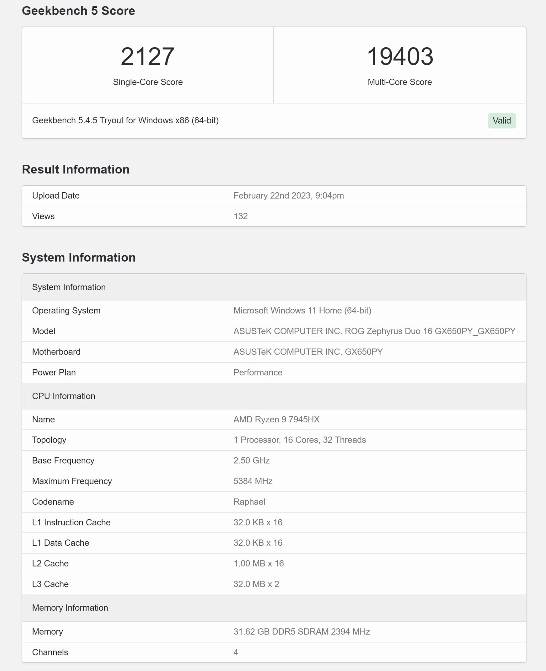 So với Rembrandt, Dragon Range được trang bị 2 CCD với 8 nhân trên mỗi chiplet, gấp đôi con số của thế hệ trước. Mức xung tối đa và TDP cũng được điều chỉnh tương ứng, 5.4 GHz và 55 W, đồng thời có thể thiết lập ở mức 75 W để đạt hiệu năng tối đa. Hệ thống chạy thử Geekbench là gaming laptop ASUS ROG Zephyrus Duo 16, bộ nhớ trong DDR5-4800 dung lượng 32 GB, cấu hình năng lượng Performance. Điểm số đơn nhân cao nhất là 2127, đa nhân 19403, trong khi đó tính trung bình đơn nhân khoảng 2061 và đơn nhân 18685.