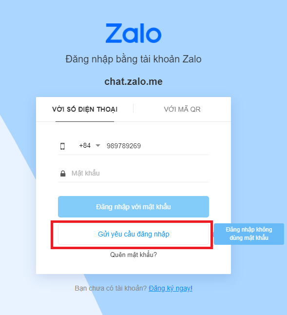 Ngoài ra, các bạn cũng có thể đăng nhập zalo web không cần mật khẩu bằng cách yêu cầu zalo gửi tin nhắn yêu cầu đăng nhập về điện thoại của mình. Cũng trên giao diện chính của điện thoại, sau khi nhập số điện thoại, các bạn bấm vào nút Gửi yêu cầu đăng nhập