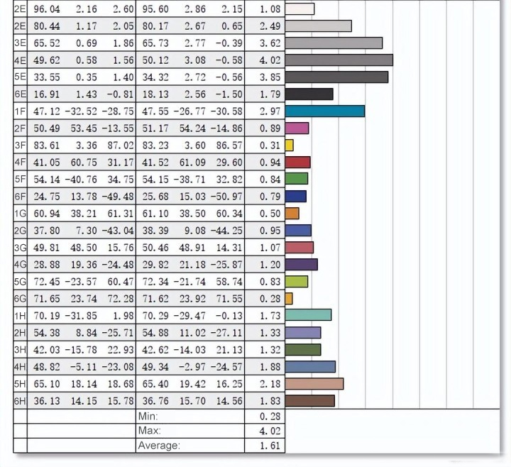 Về độ lệch màu Delta E của màn đạt giá trị lớn nhất khoảng 4.02, thấp nhất là 0.28 và trung bình vào khoảng 1.61. Chỉ số này cũng cho thấy màn hình cũng có thể đảm đương được các tác vụ chỉnh sửa ảnh và biên tập video.