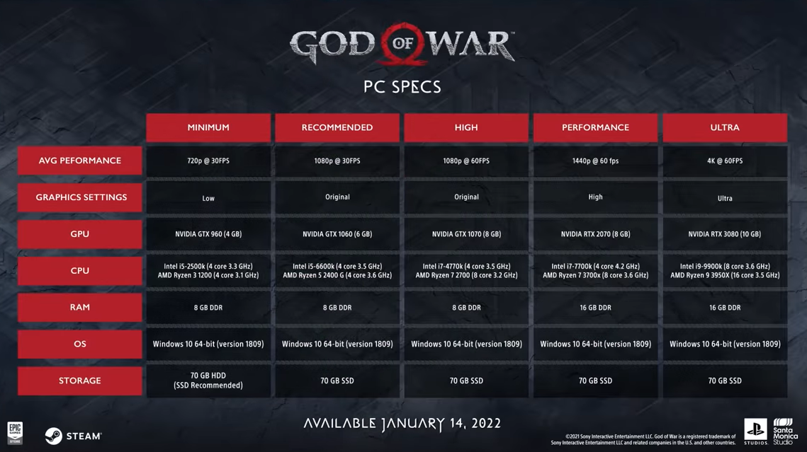 Ấn tượng hơn nữa, yêu cầu lưu trữ thực sự thấp hơn 10GB so với ước tính ban đầu, ở mức 70GB nhẹ. PC của bạn sẽ cần hỗ trợ DirectX 12 và Windows 10 64 bit ở phiên bản 1809 trở lên để chạy God of War. Các nhà phát triển cũng khuyên bạn nên lưu trữ trò chơi trên ổ SSD chơi game để chuyển đổi khu vực được liền mạch.