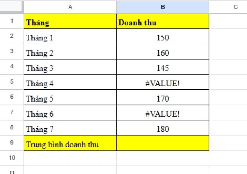 Nếu bạn dùng công thức =AVERAGE(B2:B8) thông thường, kết quả ở ô B9 sẽ là #VALUE!