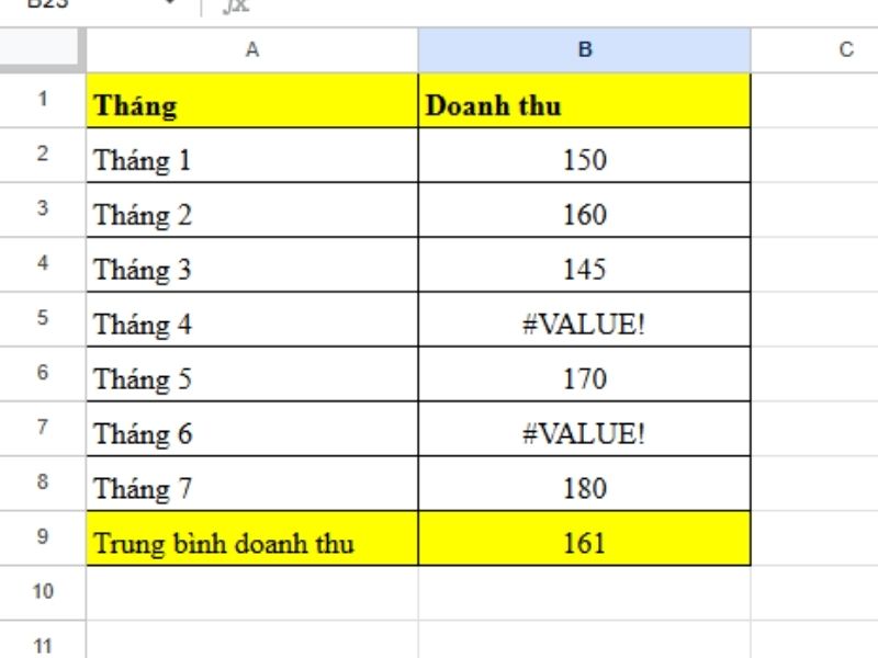 Ví dụ: Giả sử bạn có bảng dữ liệu doanh thu với một số lỗi #VALUE! như sau: