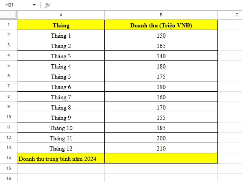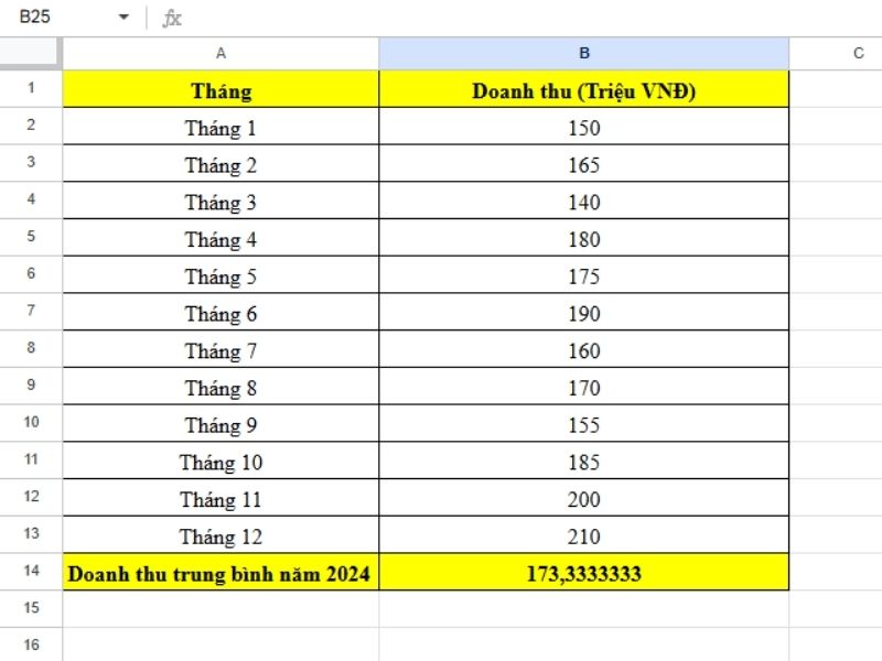 Giả sử bạn là chủ một cửa hàng và có bảng ghi nhận doanh thu hàng tháng trong năm 2024. Yêu cầu tính doanh thu trung bình hàng tháng của cả năm 2024 và hiển thị kết quả vào ô B14.