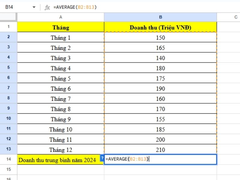 Tại ô B14, chúng ta sẽ có công thức sau: =AVERAGE(B2:B13).