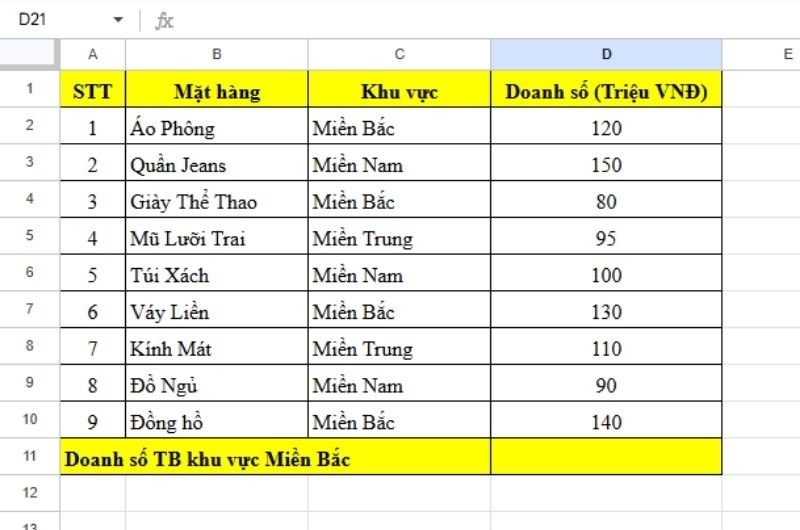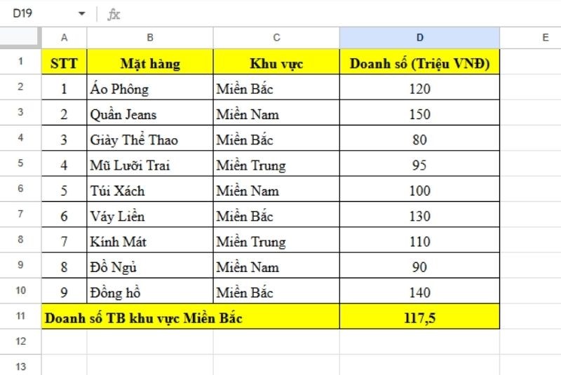 Dưới đây cũng là một bảng dữ liệu doanh số, nhưng lần này chúng ta sẽ thêm một cột "Khu vực" để minh họa cho điều kiện. Yêu cầu tính doanh số trung bình của các mặt hàng bán tại "Miền Bắc".