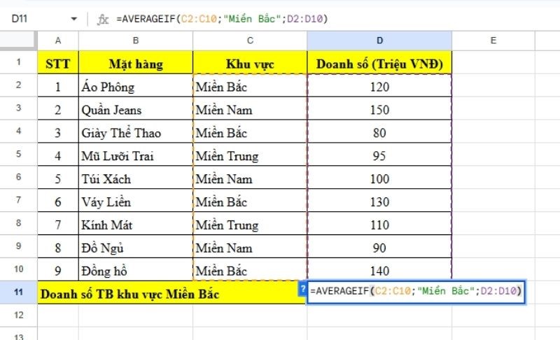 Tại ô D11, chúng ta có công thức sau: =AVERAGEIF(C2:C10;"Miền Bắc";D2:D10).