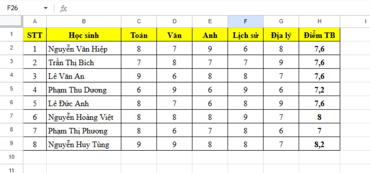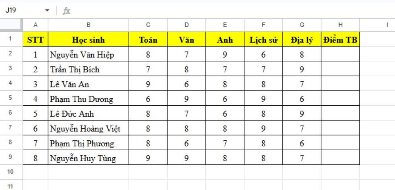 Giả sử bạn là một giáo viên và có bảng điểm thi cuối kỳ của các môn học. Yêu cầu sử dụng hàm AVERAGE trong Excel tính điểm trung bình của từng học sinh và hiển thị kết quả vào cột "Điểm TB".