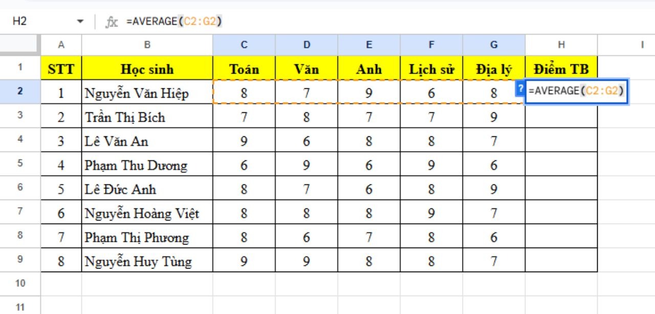 Tại ô H2, chúng ta có công thức sau: =AVERAGE(C2:G2).