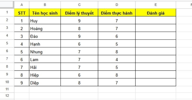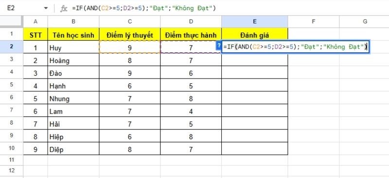 Công thức tại ô E2 là: =IF(AND(C2>=5;D2>=5);"Đạt";"Không Đạt").