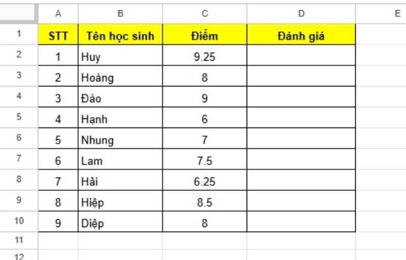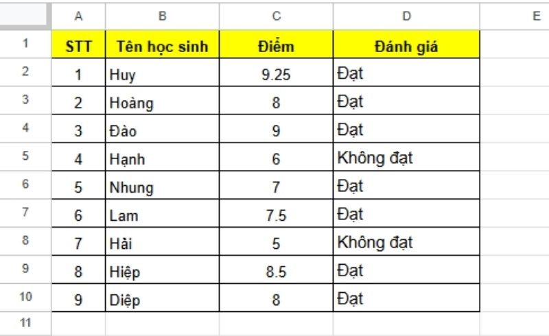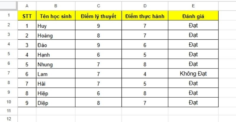 - "Không Đạt": Nếu cả 2 ô C2 và D2 đều nhỏ hơn hoặc 1 trong 2 điểm nhỏ hơn 5.