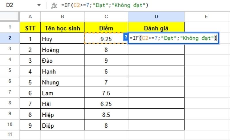 Công thức hàm IF trong Excel tại ô D2 là: =IF(C2>=7;"Đạt";"Không đạt").