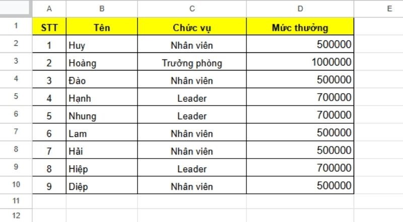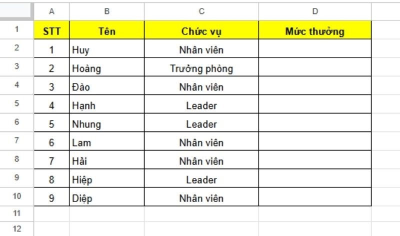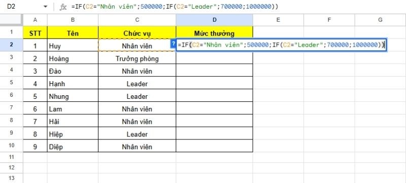 Công thức hàm IF tại ô D2 là: =IF(C2="Nhân viên";500000;IF(C2="Leader";700000;1000000)).