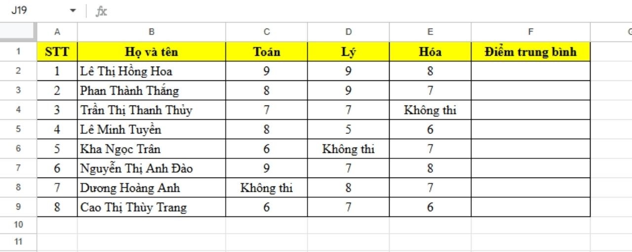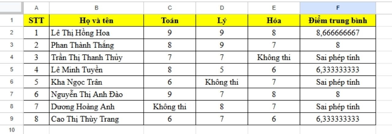 Tính trung bình cộng 3 môn dựa trên bảng điểm dưới đây mà không sử dụng hàm AVERAGE. Tuy nhiên, có một số học sinh không thi một số môn nên khi tính trung bình điểm Excel sẽ báo lỗi.