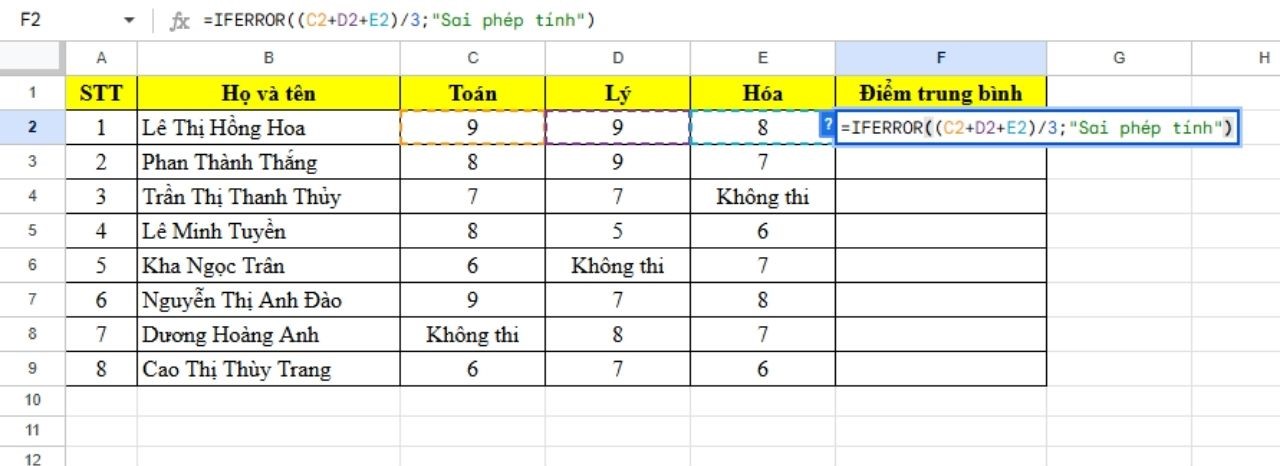 Sử dụng hàm IFERROR tính điểm trung bình cho học sinh