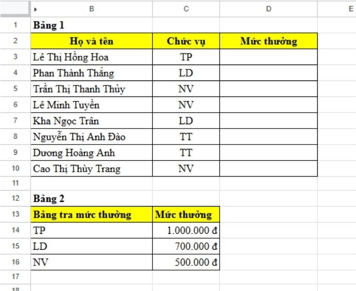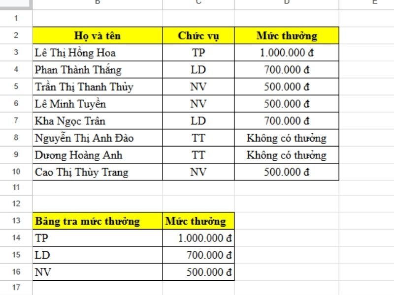 Dưới đây là bảng chi thưởng 2/9 cho nhân viên theo từng chức vụ, việc của chúng ta là xác định mức thưởng cho từng người bằng cách kết hợp với hàm VLOOKUP.