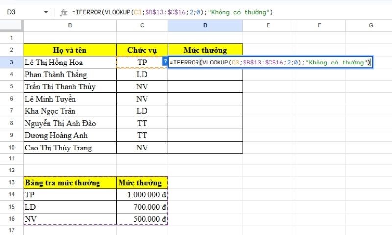 Thưởng 2/9 không có cho nhân viên TT nên thông thường giá trị Excel trả về sẽ là lỗi vì vậy sử dụng hàm IFERROR để chuyển lỗi thành “Không được thưởng”. Tại ô D3, chúng ta có công thức sau: =IFERROR(VLOOKUP(C3;$B$13:$C$16;2;0);"Không có thưởng").