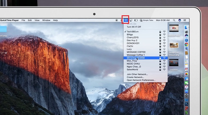 Bước 4: Trên Macbook, bạn vào biểu tượng Wifi, rồi chọn Wifi Mirroring để kết nối Wifi.