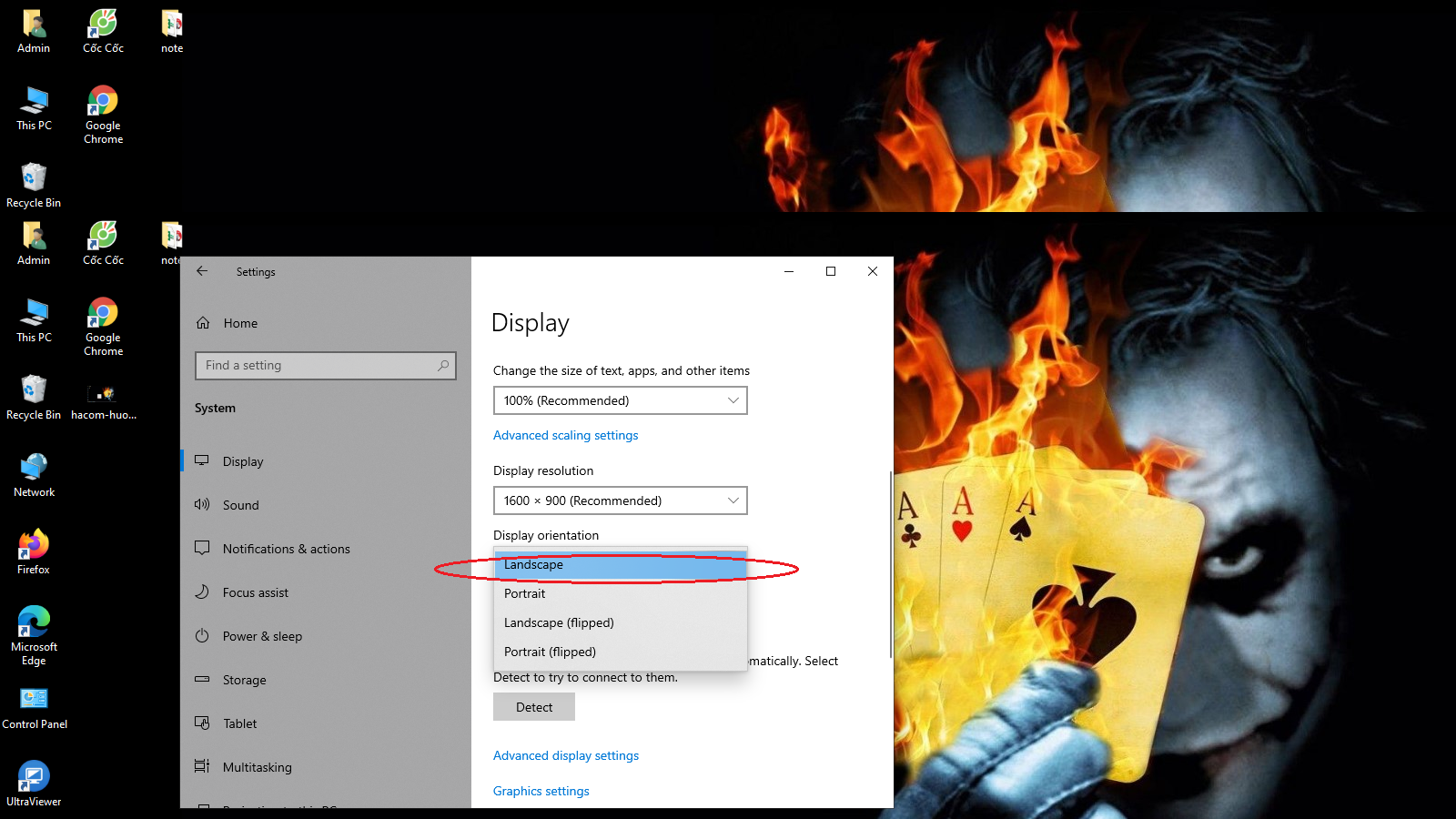 Bước 2: Trong cửa sổ Display hiển thị, bạn kéo xuống mục Display orientation, chọn về Landscape