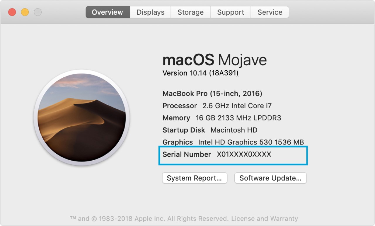 Trong hệ thống: Vào menu Apple > Giới thiệu về máy Mac này (About This Mac) > tab Tổng quan (Overview) để xem số serial.