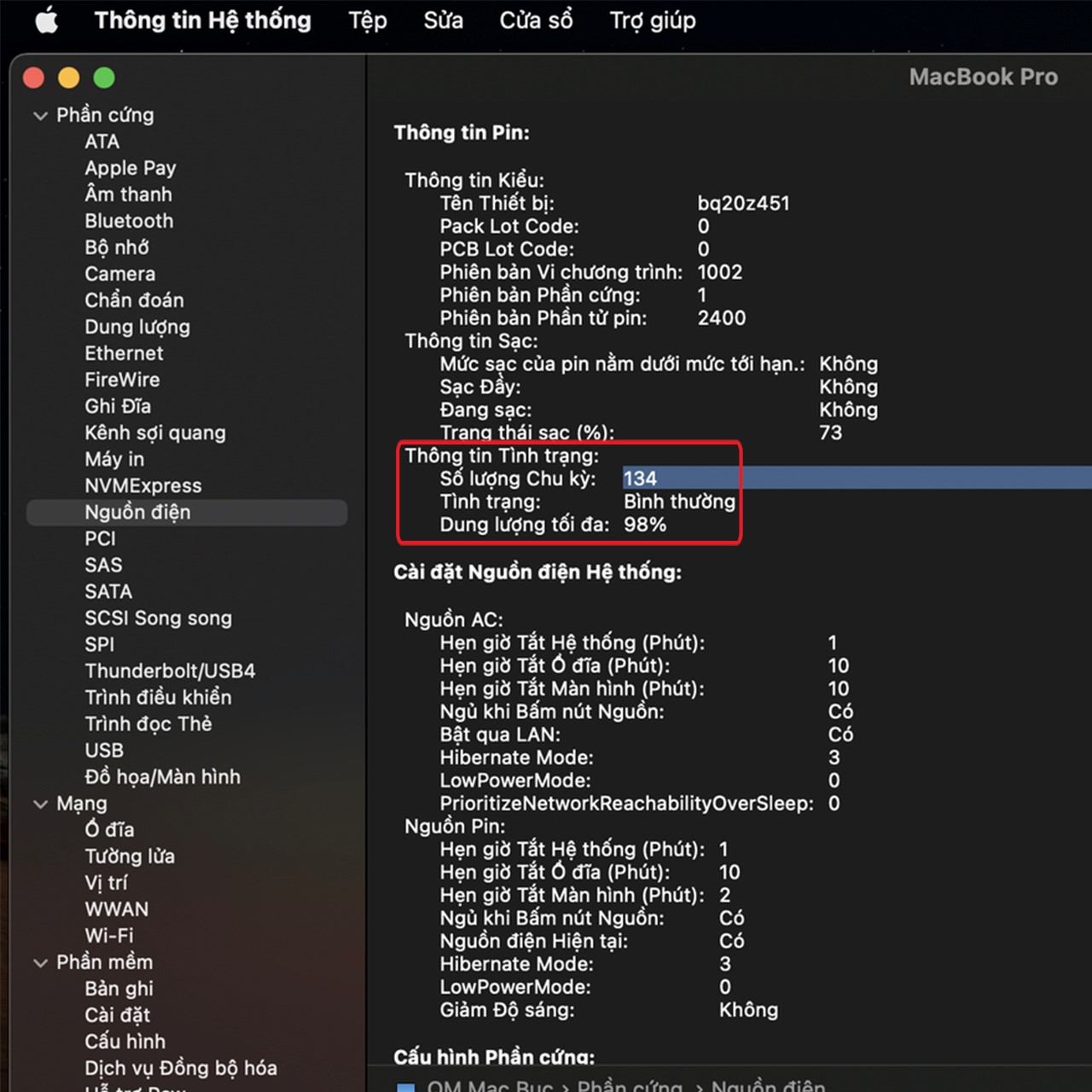 Pin: Vào Cài đặt hệ thống > Pin > Tình trạng pin (Battery Health) để xem dung lượng pin hiện tại so với dung lượng thiết kế. Một chiếc MacBook cũ có số chu kỳ sạc (cycle count) dưới 500 thường còn tốt. Nếu pin hiển thị thông báo “Cần thay thế” (Service Battery), hãy cân nhắc chi phí thay pin.