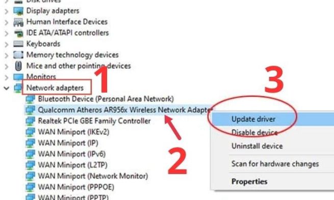 - Bước 2: Mở rộng mục Network adapters, nhấp chuột phải vào driver WiFi, chọn Update driver.