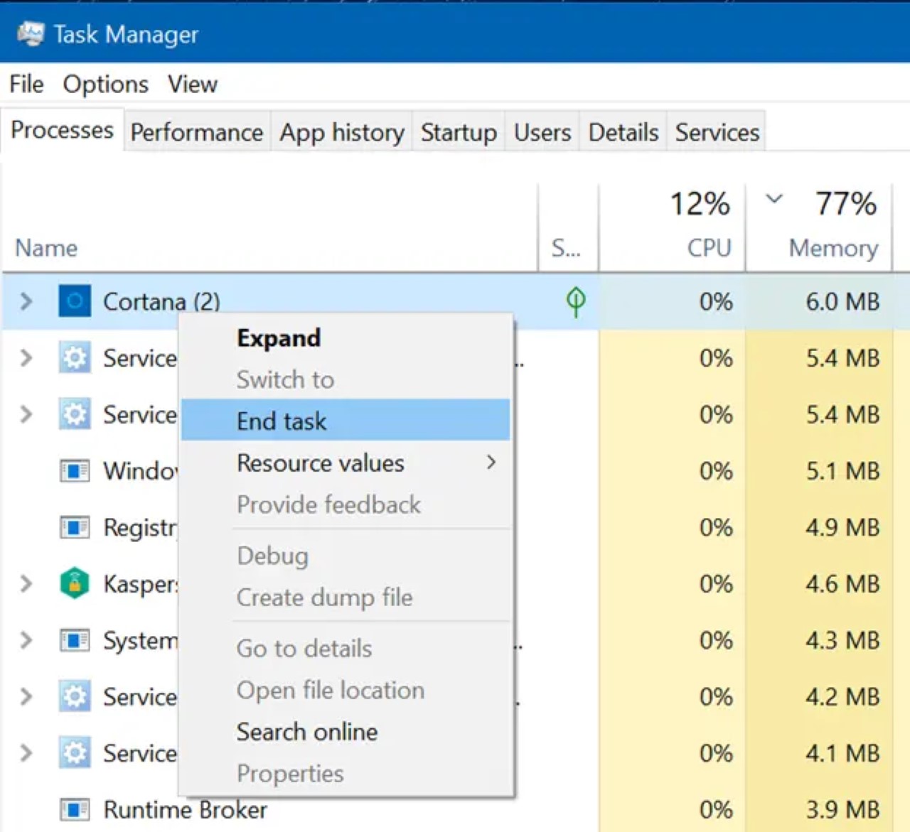 - Tại tab Processes, tìm đến Cortana, click chuột phải và chọn End Task.