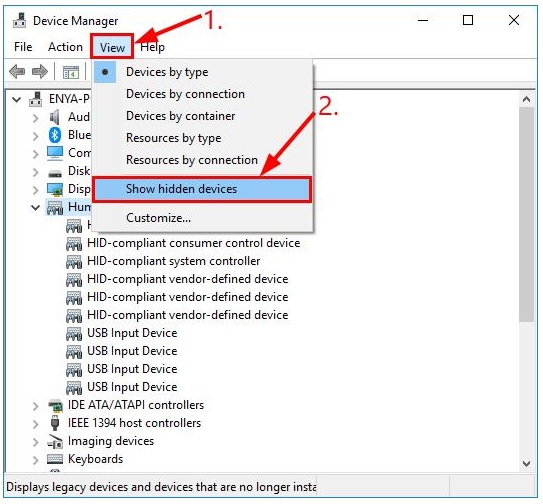 - Bước 2: Trên cửa sổ Device Manager, click chọn View sau đó chọn Show hidden devices.