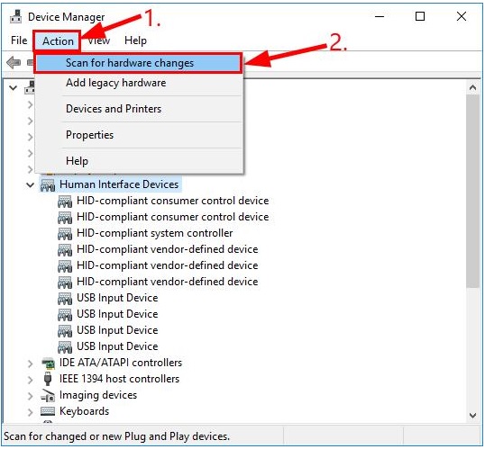 - Bước 3: Click chọn Action > Scan for hardware changes.