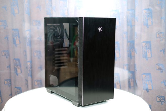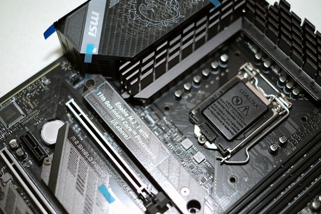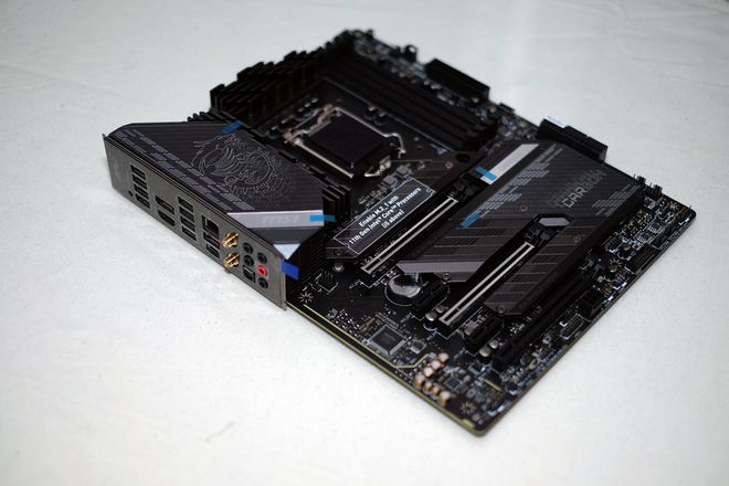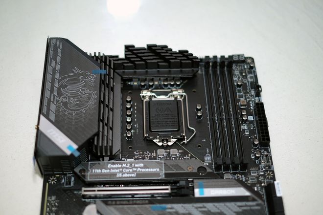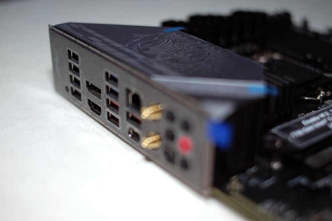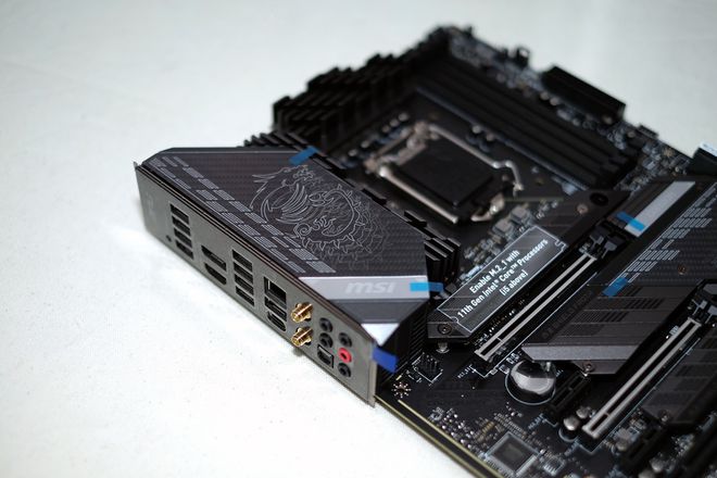 Phần tản nhiệt lớn được ẩn bớt bên dưới tấm che khu vực I/O, có logo MSI Dragon và một tấm huy hiệu bằng bạc được khắc dòng chữ MSI.